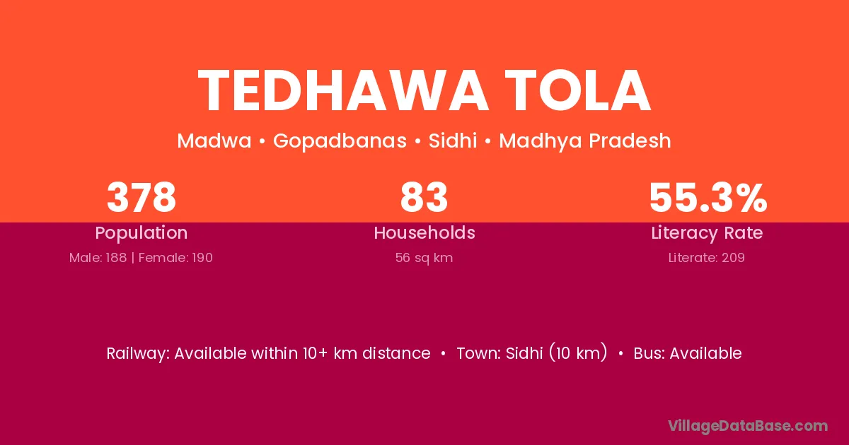 Tedhawa Tola village has a total population of 378 people, of which 188 are males and 190 are females.
