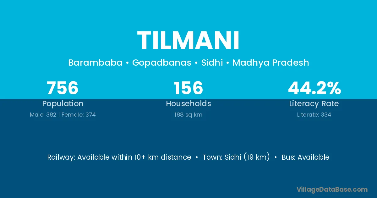 Sidhi (19 km) is the nearest town to Tilmani village for major economic activities and is located approximately 19 km away.