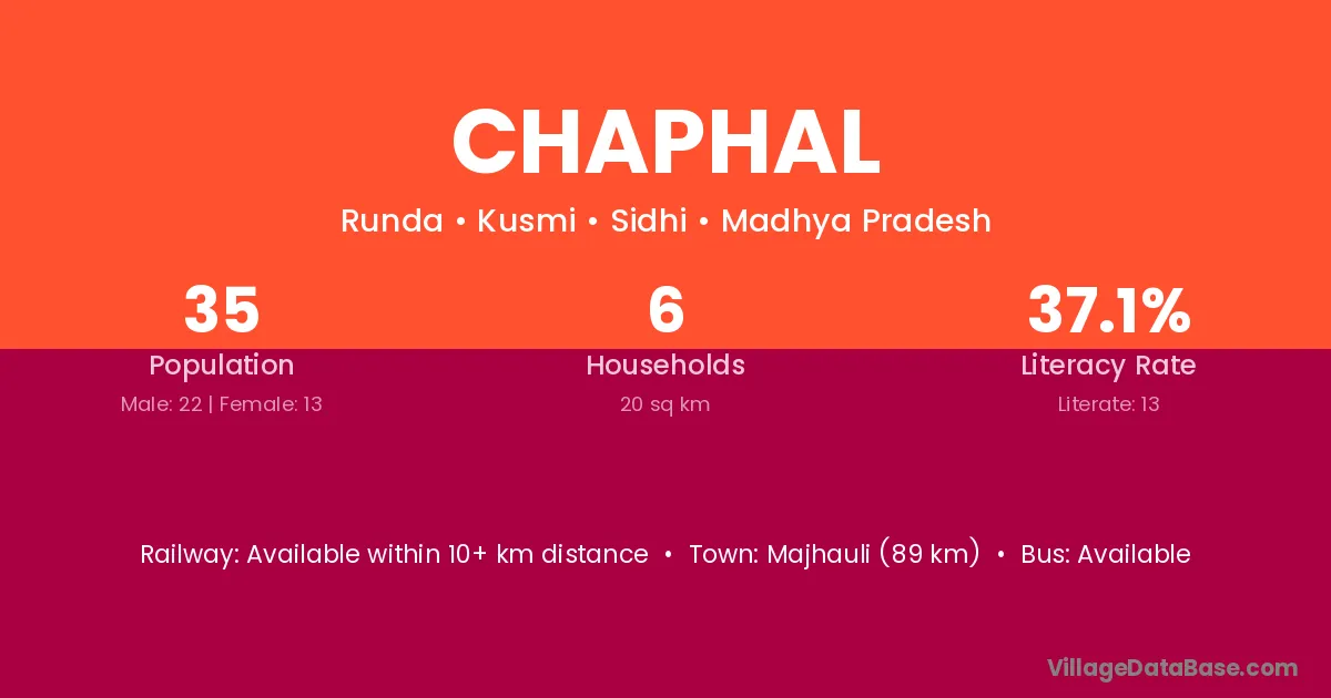Chaphal village has a total population of 35 people, of which 22 are males and 13 are females.