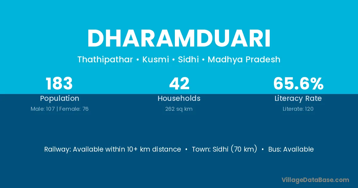 Sidhi (70 km) is the nearest town to Dharamduari village for major economic activities and is located approximately 70 km away.