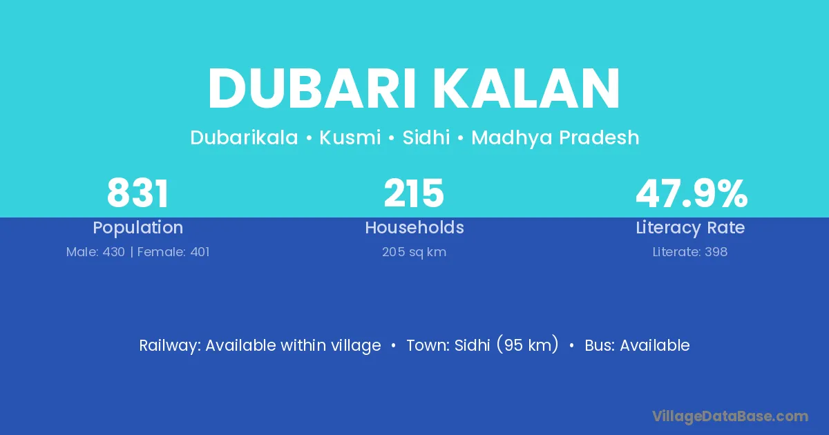 Sidhi (95 km) is the nearest town to Dubari Kalan village for major economic activities and is located approximately 95 km away.