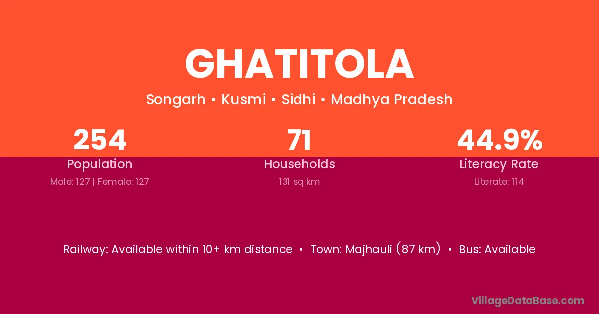 Ghatitola village has a total population of 254 people, of which 127 are males and 127 are females.