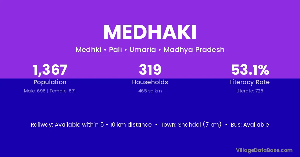Majhauli (20 km) is the nearest town to Medhaki village for major economic activities and is located approximately 20 km away.