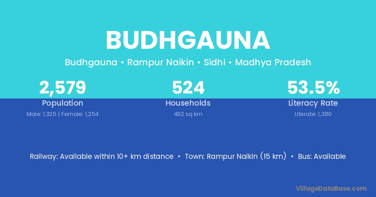 Budhgauna village has a total population of 2,579 people, of which 1,325 are males and 1,254 are females.