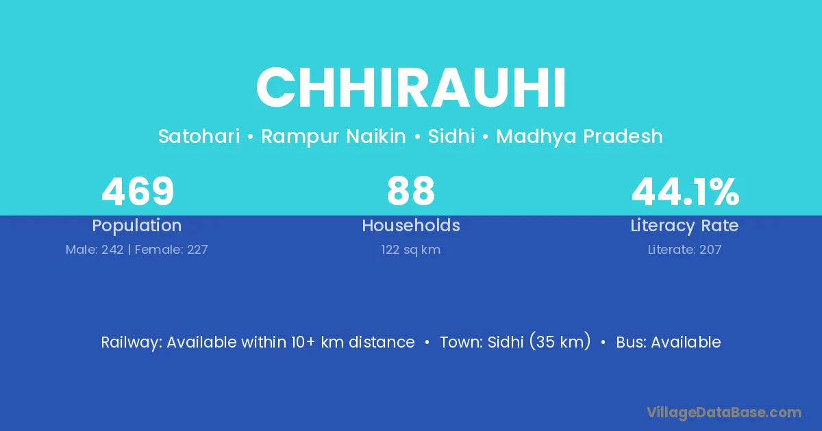 Sidhi (35 km) is the nearest town to Chhirauhi village for major economic activities and is located approximately 35 km away.