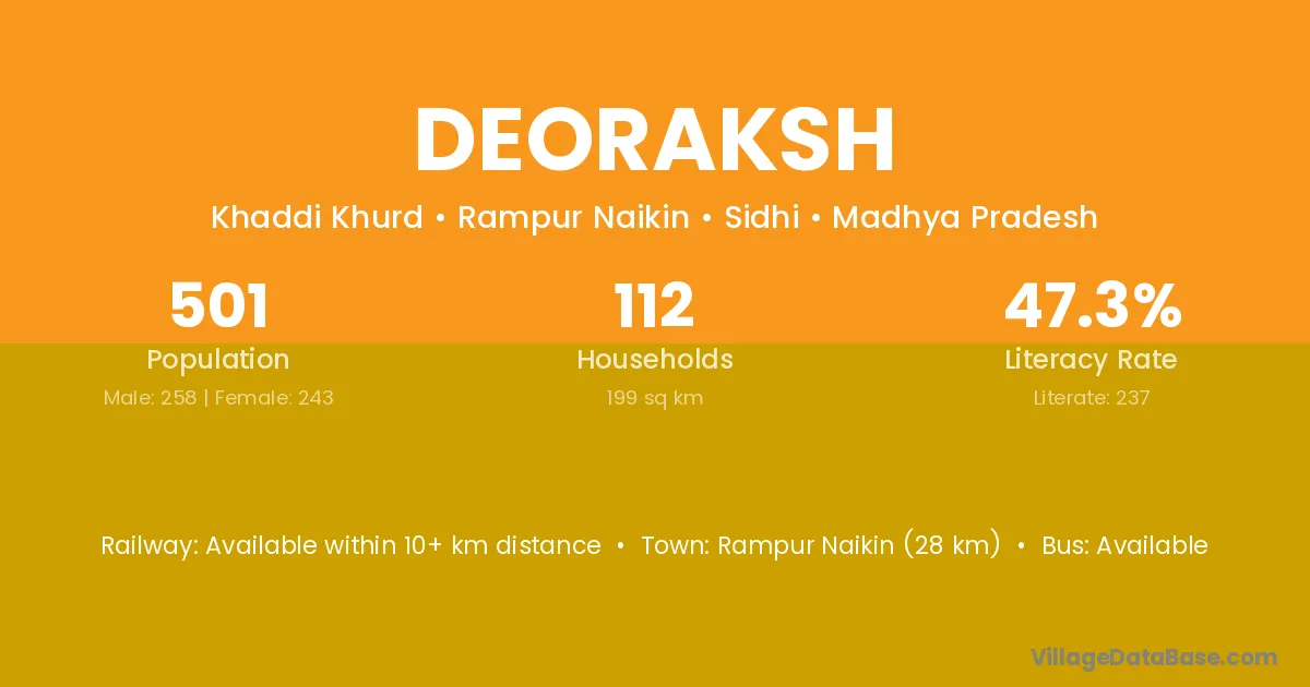 Deoraksh village has a total population of 501 people, of which 258 are males and 243 are females.