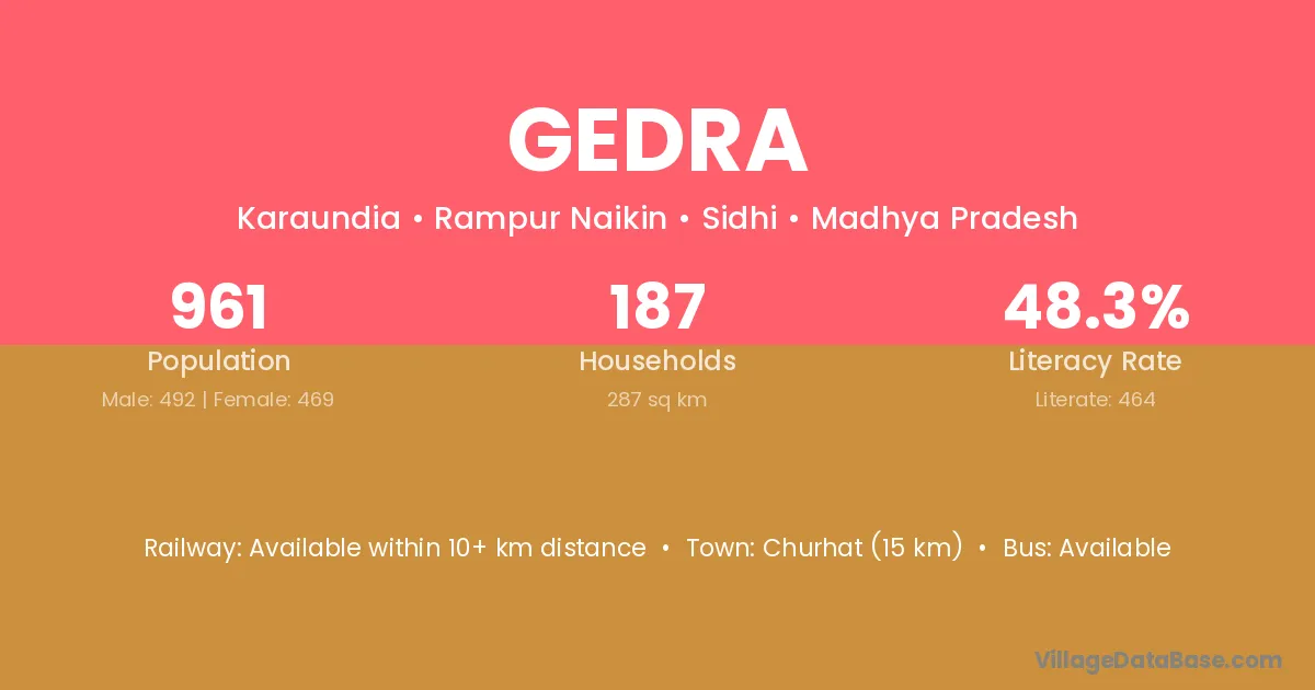 Churhat (15 km) is the nearest town to Gedra village for major economic activities and is located approximately 15 km away.