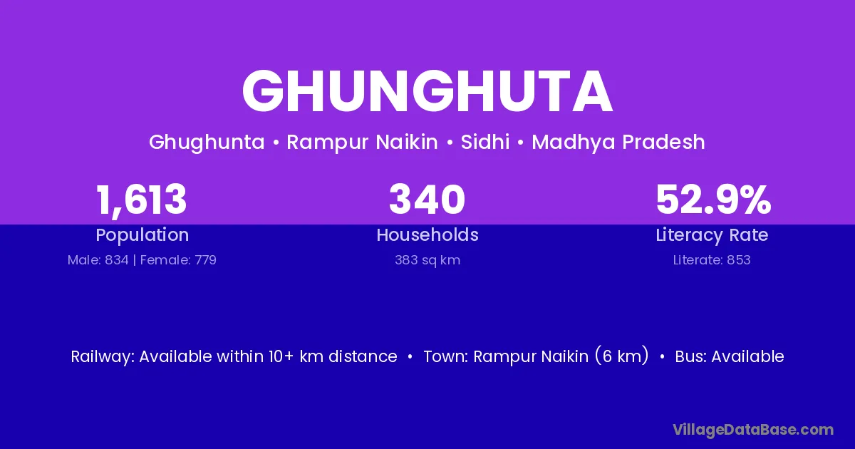 Ghunghuta village has a total population of 1,613 people, of which 834 are males and 779 are females.