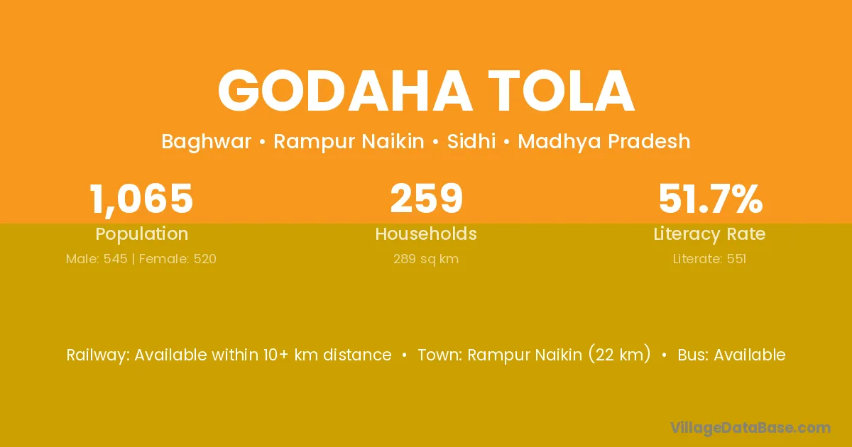 Godaha Tola village has a total population of 1,065 people, of which 545 are males and 520 are females.