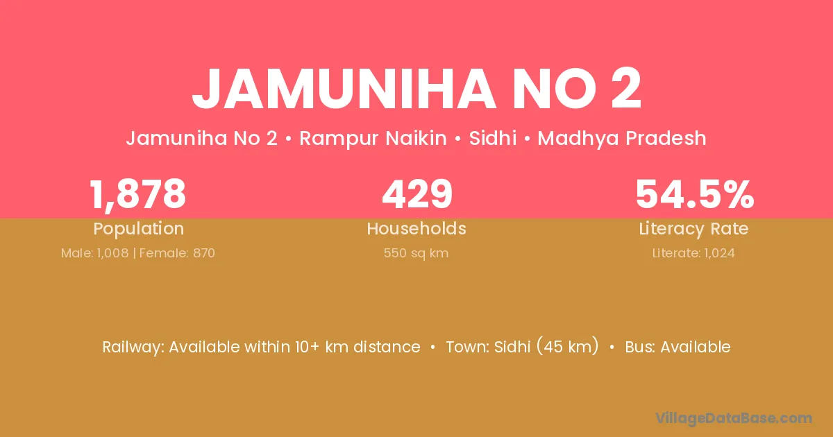 Jamuniha No 2 village has a total population of 1,878 people, of which 1,008 are males and 870 are females.