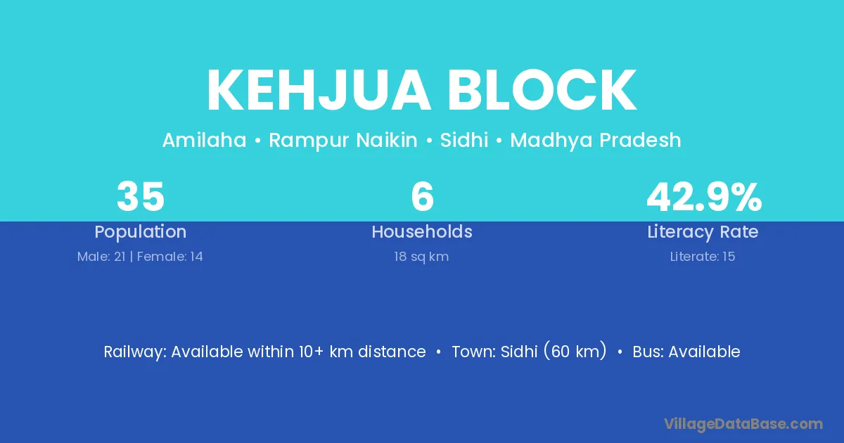 Sidhi (60 km) is the nearest town to Kehjua Block village for major economic activities and is located approximately 60 km away.