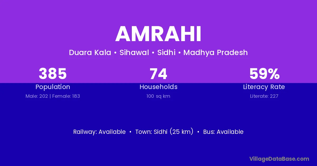 Sidhi (25 km) is the nearest town to Amrahi village for major economic activities and is located approximately 25 km away.