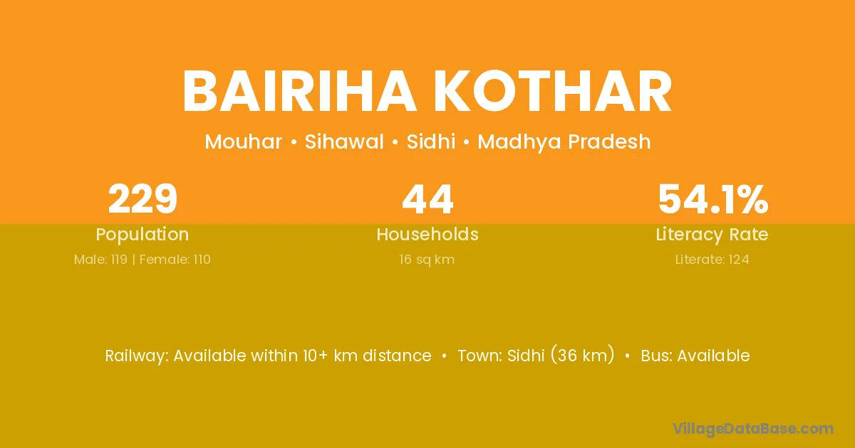 Bairiha Kothar village has a total population of 229 people, of which 119 are males and 110 are females.