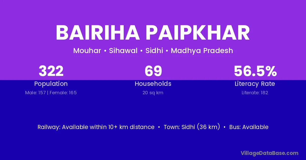 Sidhi (36 km) is the nearest town to Bairiha Paipkhar village for major economic activities and is located approximately 36 km away.