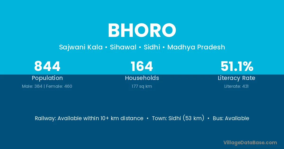 Sidhi (53 km) is the nearest town to Bhoro village for major economic activities and is located approximately 53 km away.