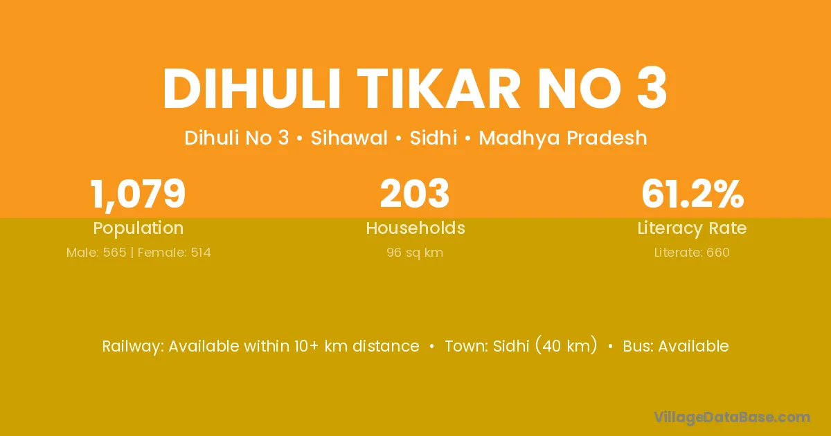 Sidhi (40 km) is the nearest town to Dihuli Tikar No 3 village for major economic activities and is located approximately 40 km away.