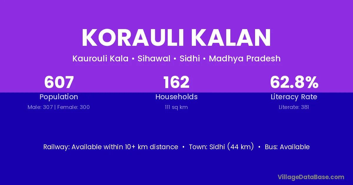 Sidhi (44 km) is the nearest town to Korauli Kalan village for major economic activities and is located approximately 44 km away.