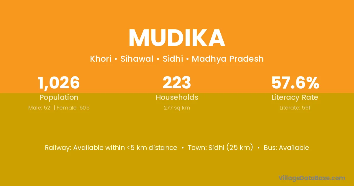 Sidhi (25 km) is the nearest town to Mudika village for major economic activities and is located approximately 25 km away.