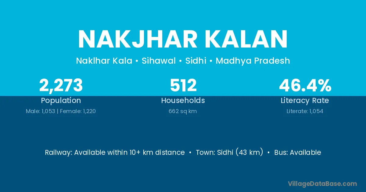 Sidhi (43 km) is the nearest town to Nakjhar Kalan village for major economic activities and is located approximately 43 km away.