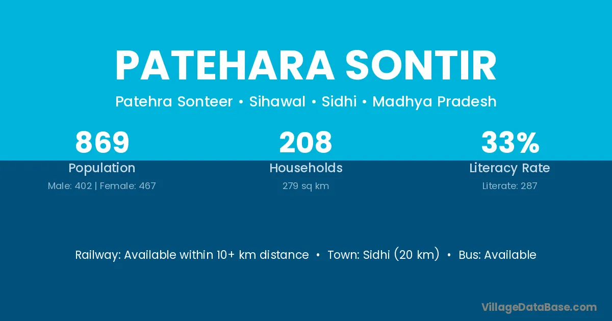 Sidhi (20 km) is the nearest town to Patehara Sontir village for major economic activities and is located approximately 20 km away.