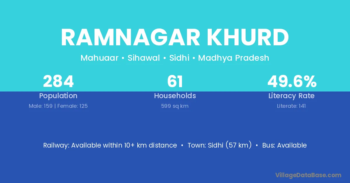 Sidhi (57 km) is the nearest town to Ramnagar Khurd village for major economic activities and is located approximately 57 km away.