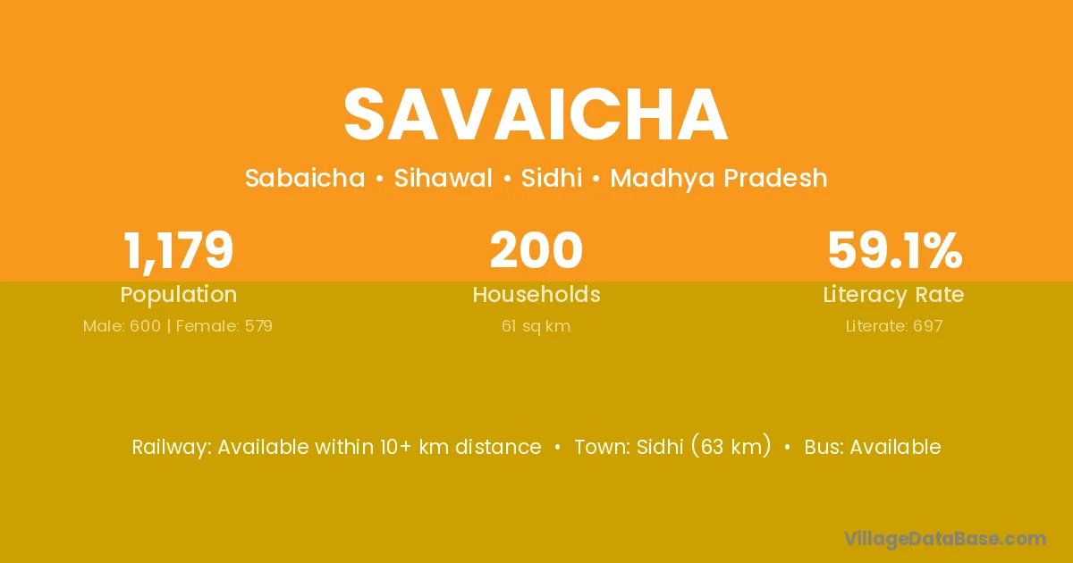 Sidhi (63 km) is the nearest town to Savaicha village for major economic activities and is located approximately 63 km away.
