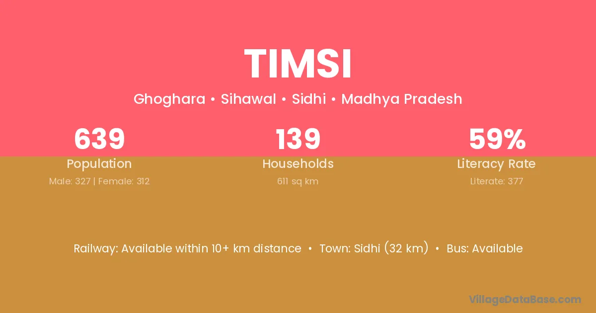 Sidhi (32 km) is the nearest town to Timsi village for major economic activities and is located approximately 32 km away.