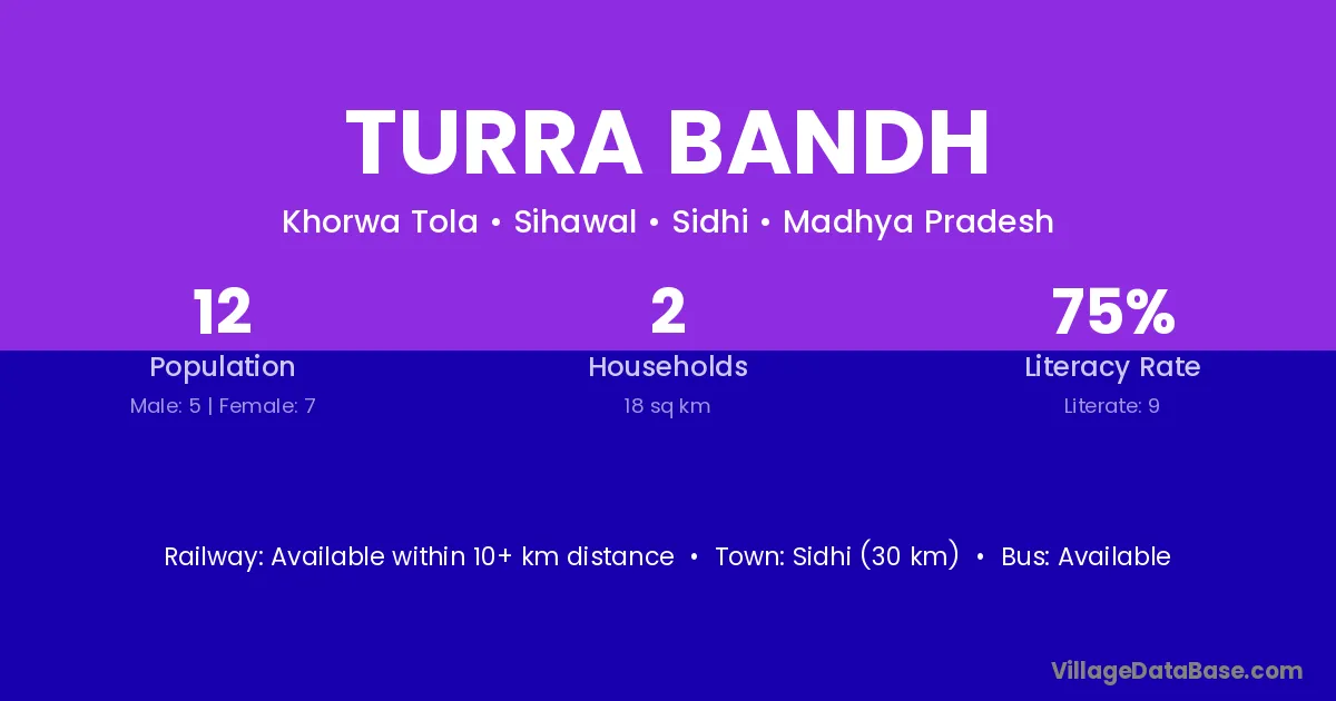Sidhi (30 km) is the nearest town to Turra Bandh village for major economic activities and is located approximately 30 km away.