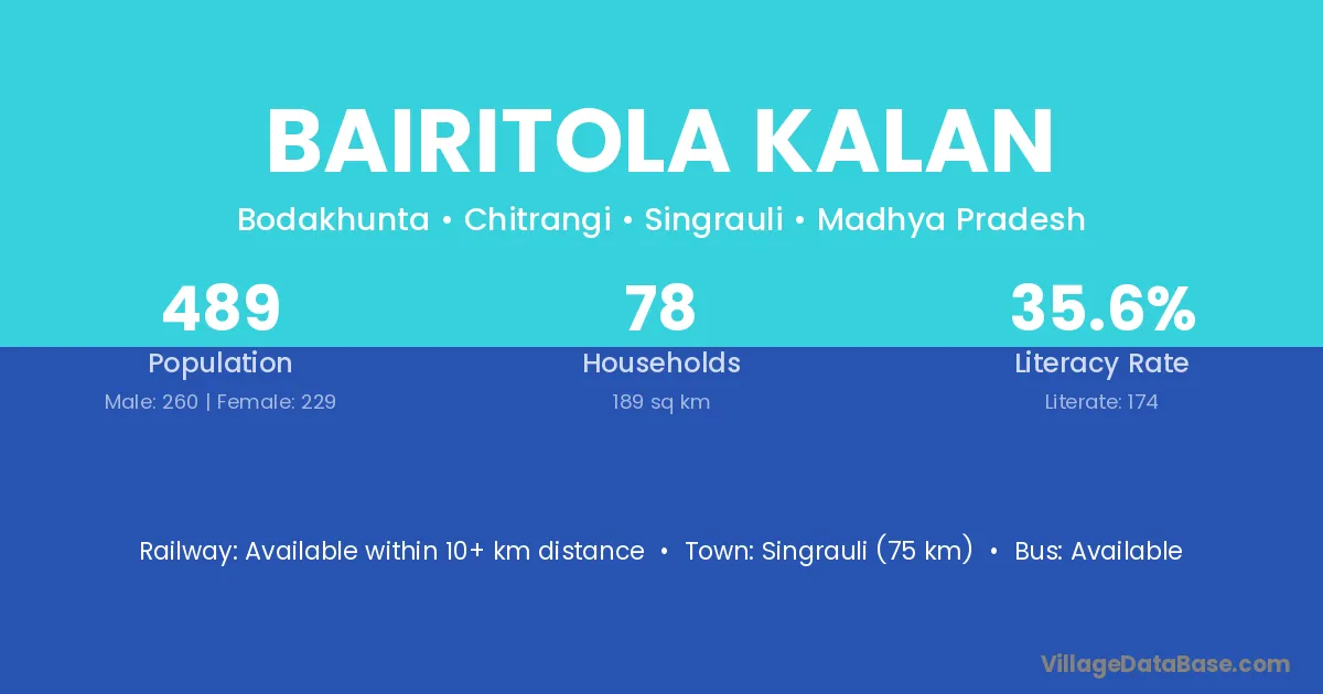 Singrauli (75 km) is the nearest town to Bairitola Kalan village for major economic activities and is located approximately 75 km away.