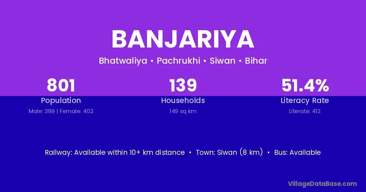 Singrauli (108 km) is the nearest town to Banjariya village for major economic activities and is located approximately 108 km away.