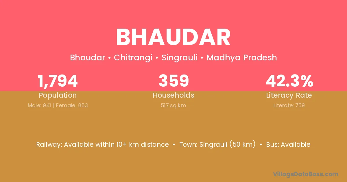 Singrauli (50 km) is the nearest town to Bhaudar village for major economic activities and is located approximately 50 km away.