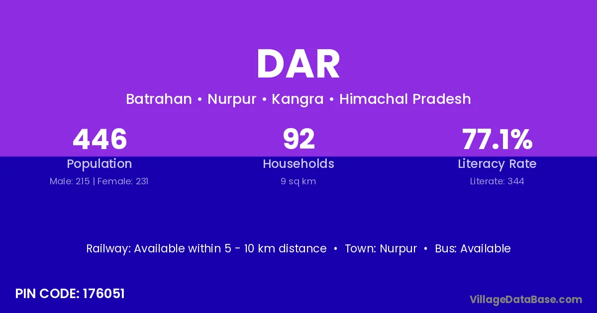 The literacy rate of Dar village is 28.35%. Male literacy stands at 34.20% and female literacy at 21.75%.