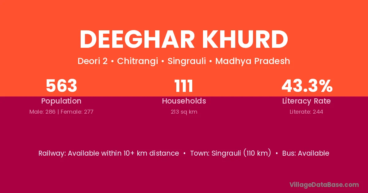 Deeghar Khurd village has a total population of 563 people, of which 286 are males and 277 are females.