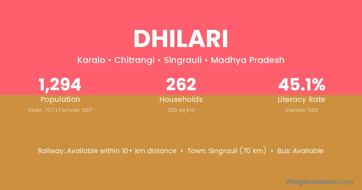 Singrauli (70 km) is the nearest town to Dhilari village for major economic activities and is located approximately 70 km away.