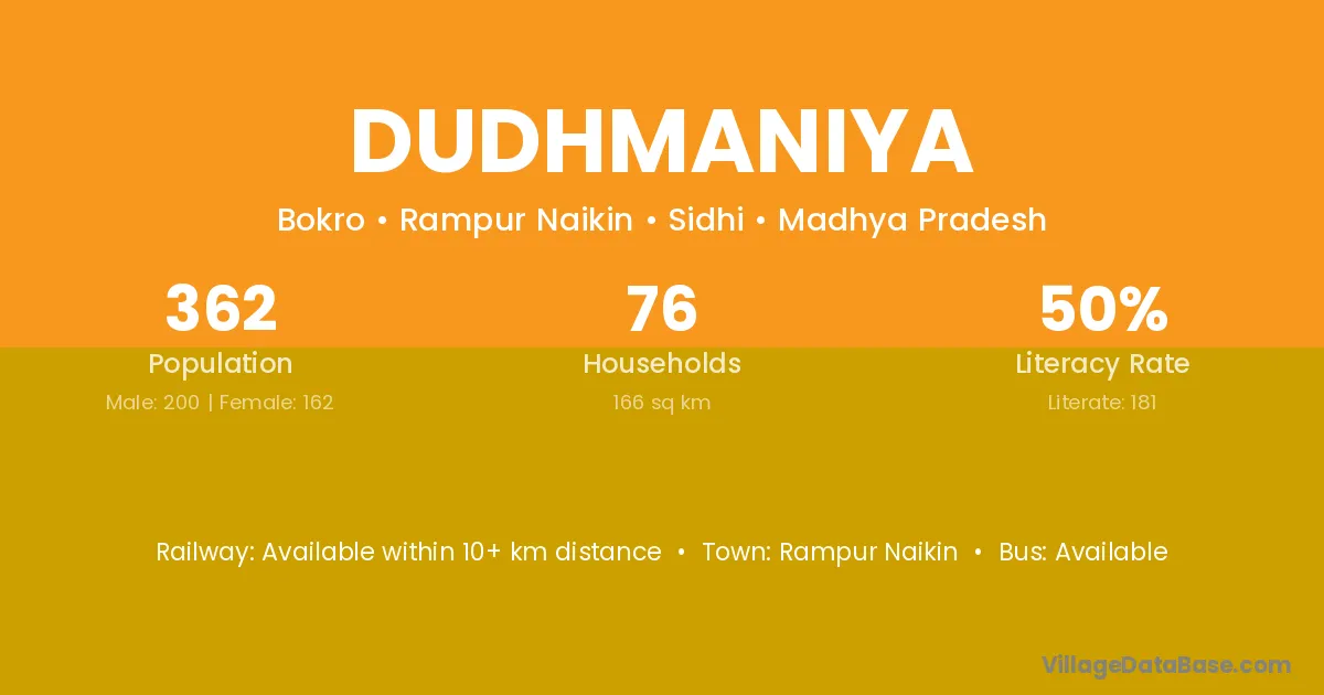 Morva (25 km) is the nearest town to Dudhmaniya village for major economic activities and is located approximately 25 km away.