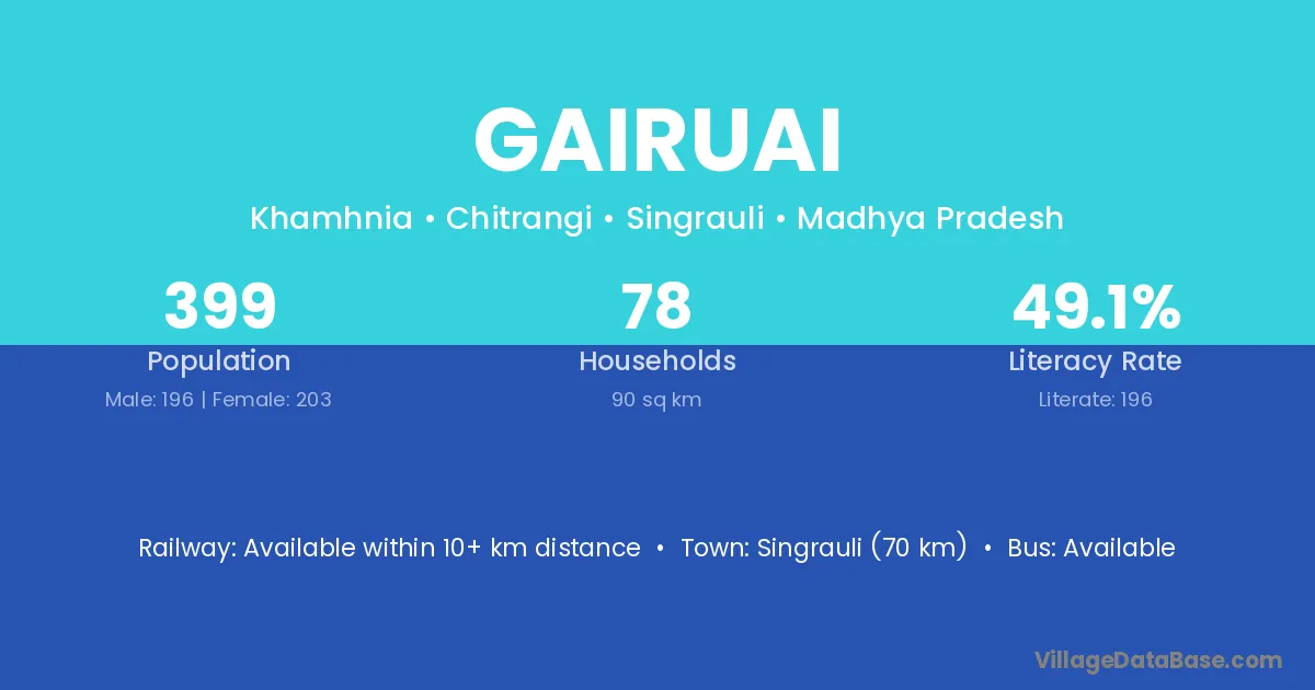 Singrauli (70 km) is the nearest town to Gairuai village for major economic activities and is located approximately 70 km away.
