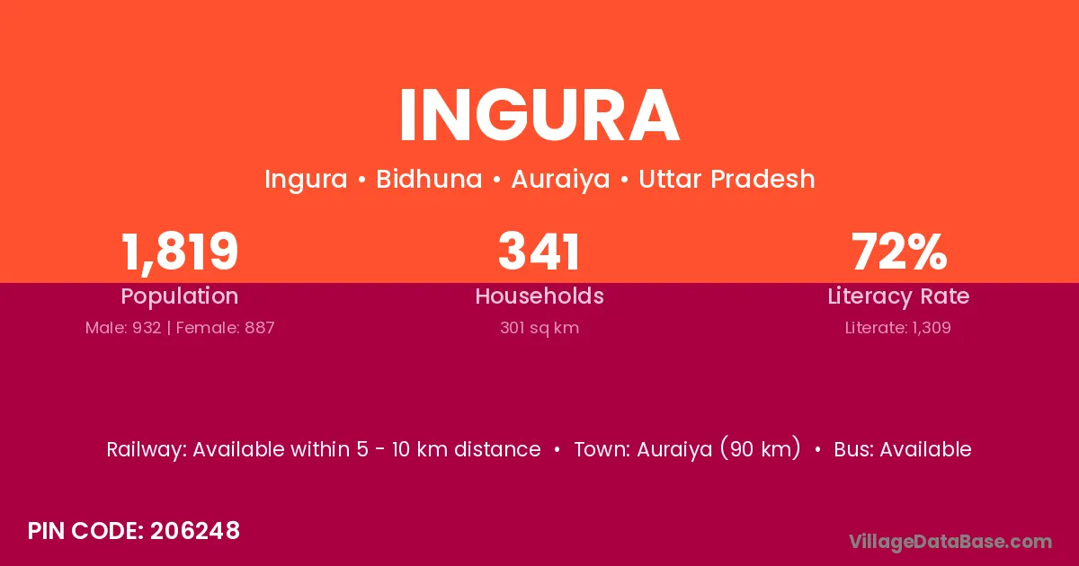 The literacy rate of Ingura village is 32.95%. Male literacy stands at 38.37% and female literacy at 27.59%.