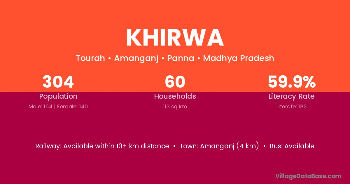 The literacy rate of Khirwa village is 38.97%. Male literacy stands at 47.67% and female literacy at 29.47%.