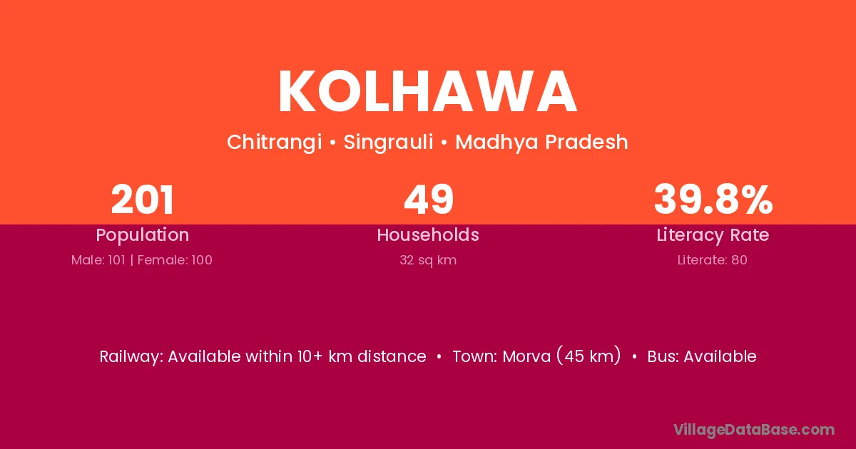 Morva (45 km) is the nearest town to Kolhawa village for major economic activities and is located approximately 45 km away.