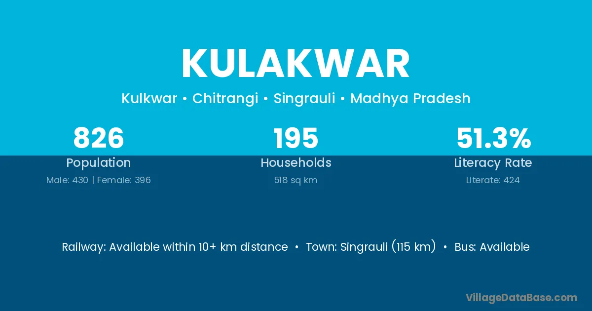 Singrauli (115 km) is the nearest town to Kulakwar village for major economic activities and is located approximately 115 km away.
