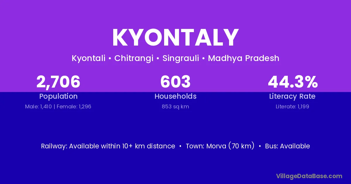 Kyontaly village has a total population of 2,706 people, of which 1,410 are males and 1,296 are females.
