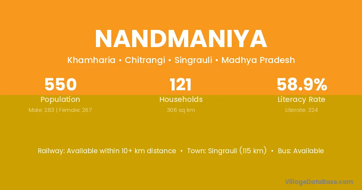 Singrauli (115 km) is the nearest town to Nandmaniya village for major economic activities and is located approximately 115 km away.