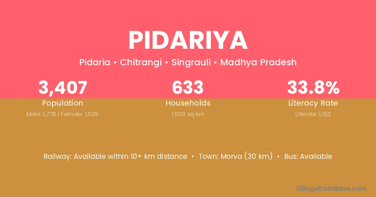 Morva (30 km) is the nearest town to Pidariya village for major economic activities and is located approximately 30 km away.
