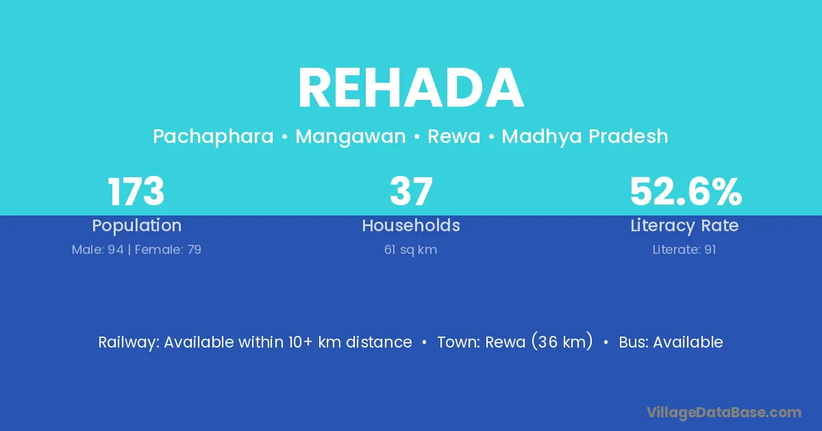 Morva (55 km) is the nearest town to Rehada village for major economic activities and is located approximately 55 km away.