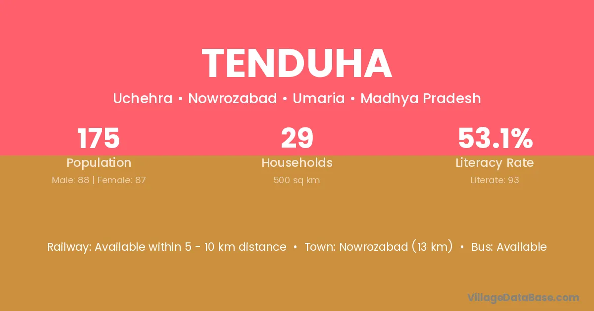 Morva (45 km) is the nearest town to Tenduha village for major economic activities and is located approximately 45 km away.