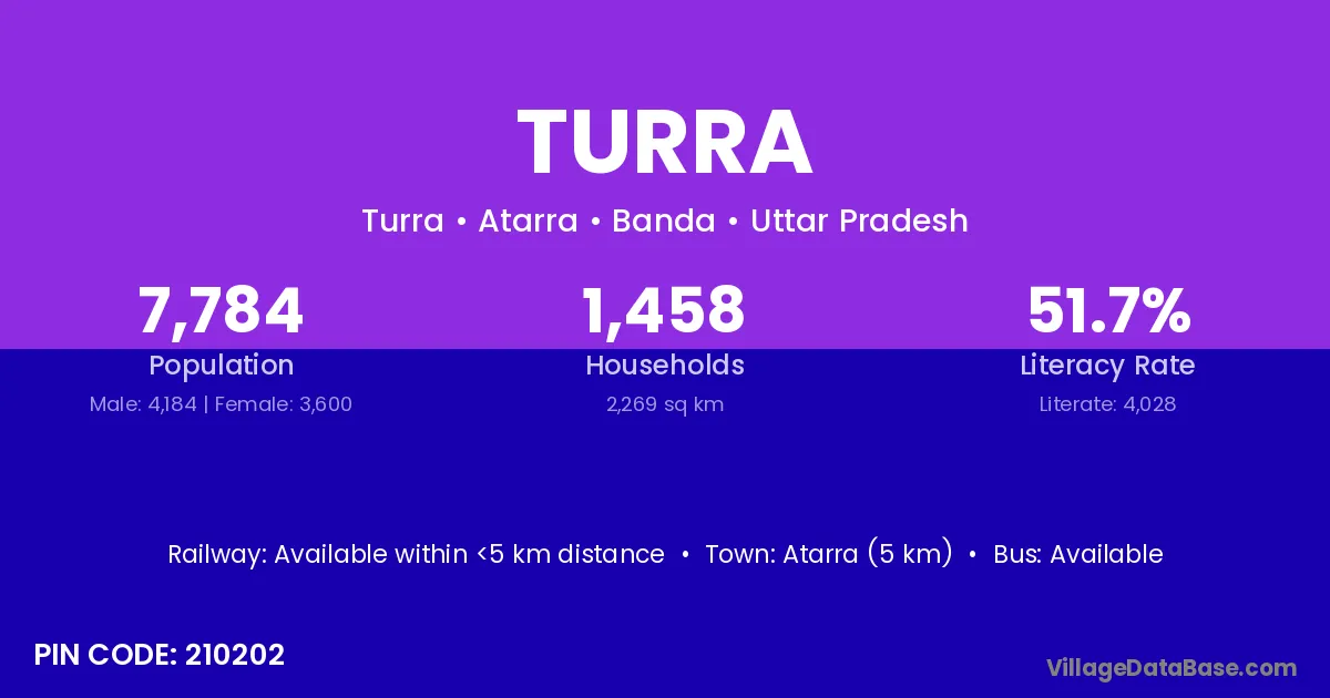 The literacy rate of Turra village is 38.16%. Male literacy stands at 44.39% and female literacy at 32.61%.