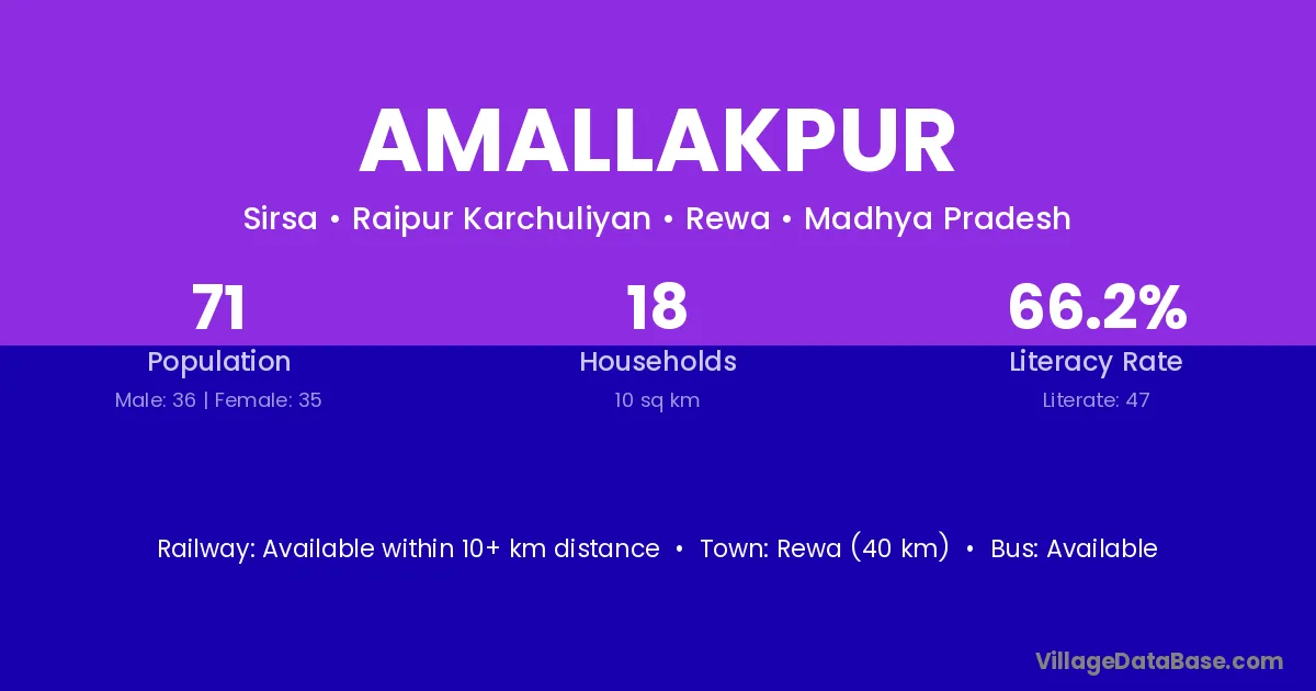 Sidhi (66 km) is the nearest town to Amallakpur village for major economic activities and is located approximately 66 km away.