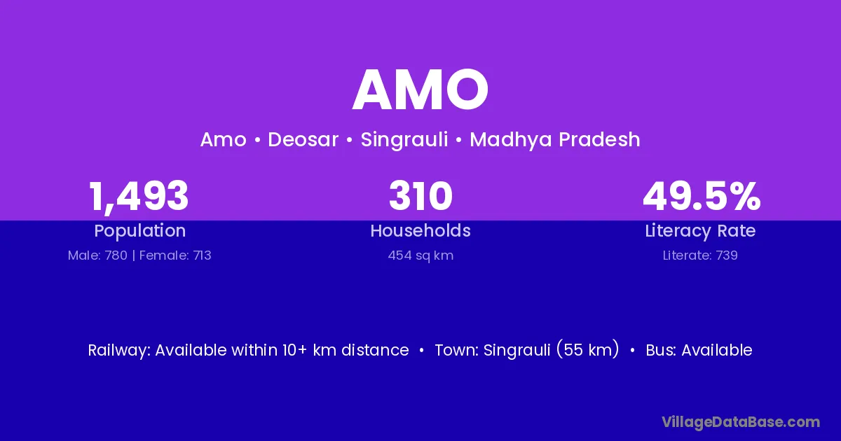 Singrauli (55 km) is the nearest town to Amo village for major economic activities and is located approximately 55 km away.