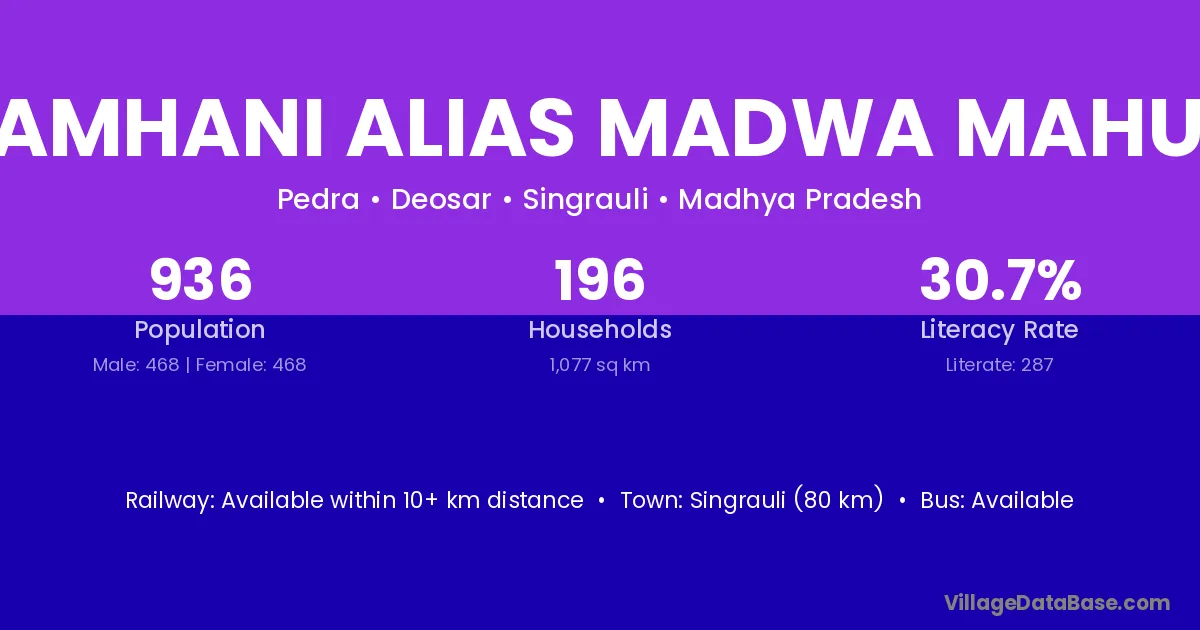 Bamhani Alias Madwa Mahua village has a total population of 936 people, of which 468 are males and 468 are females.