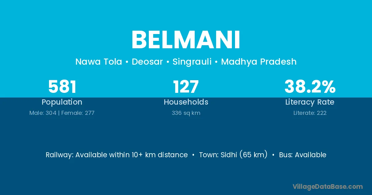 Sidhi (65 km) is the nearest town to Belmani village for major economic activities and is located approximately 65 km away.